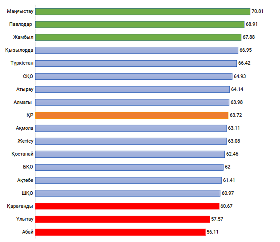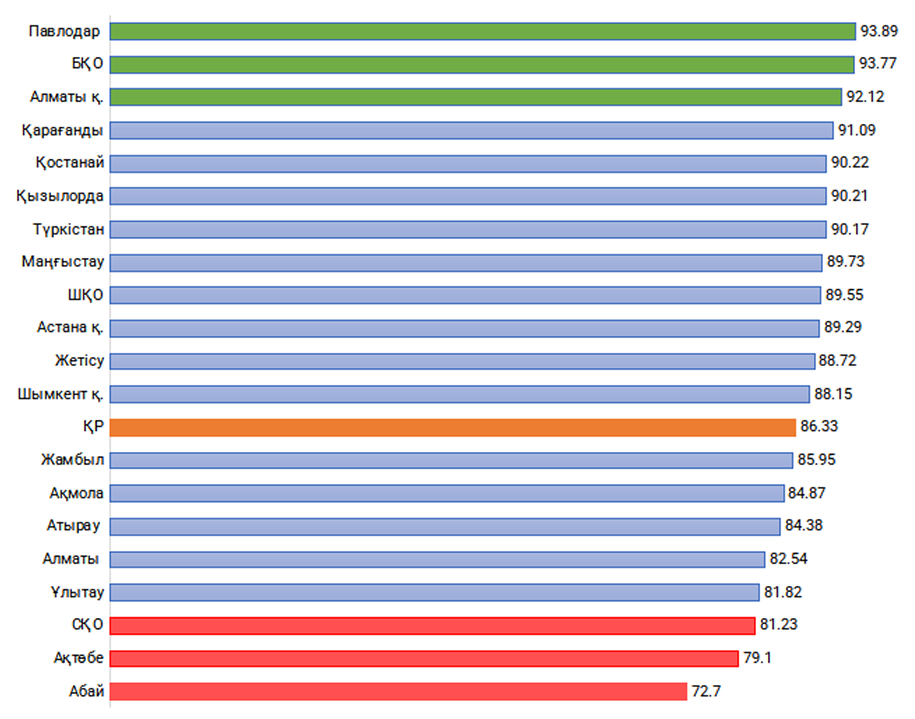 Қамтамасыз етудің ең төмен көрсеткіштері Абай (56,1%), Ұлытау (57,57%) және Қарағанды (60,67%) облыстарының ауылдық елді мекендерінде тіркеледі.