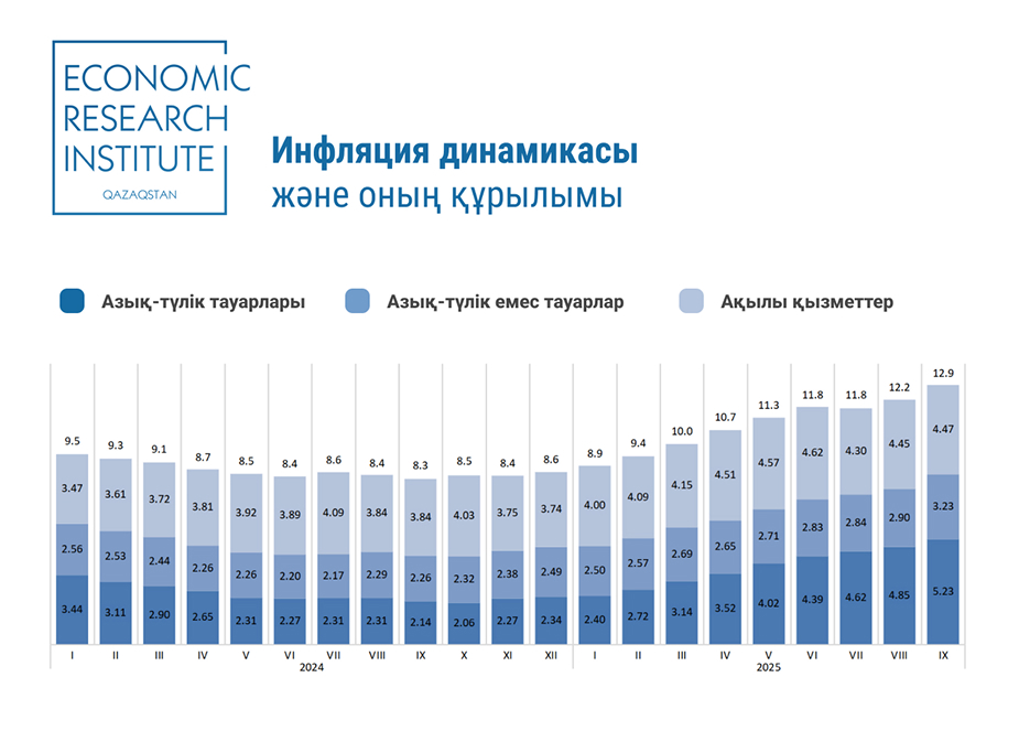 Инфляцияның қарқынына негізгі үлесті азық-түлік тауарлары қосып отыр - 40,5% (яғни, жалпы инфляцияның 12,9%-нің 5,23%-і азық-түлік тауарларына тиесілі). 2024 жылдың қыркүйегінде азық-түлік тауарларының үлесі жалпы инфляцияның 25,8%-ін құрады. Бұрын инфляцияға ақылы қызметтер жоғары үлес қосқан (2024 жылдың қаңтарынан 2025 жылдың маусымына дейінгі аралықта).
