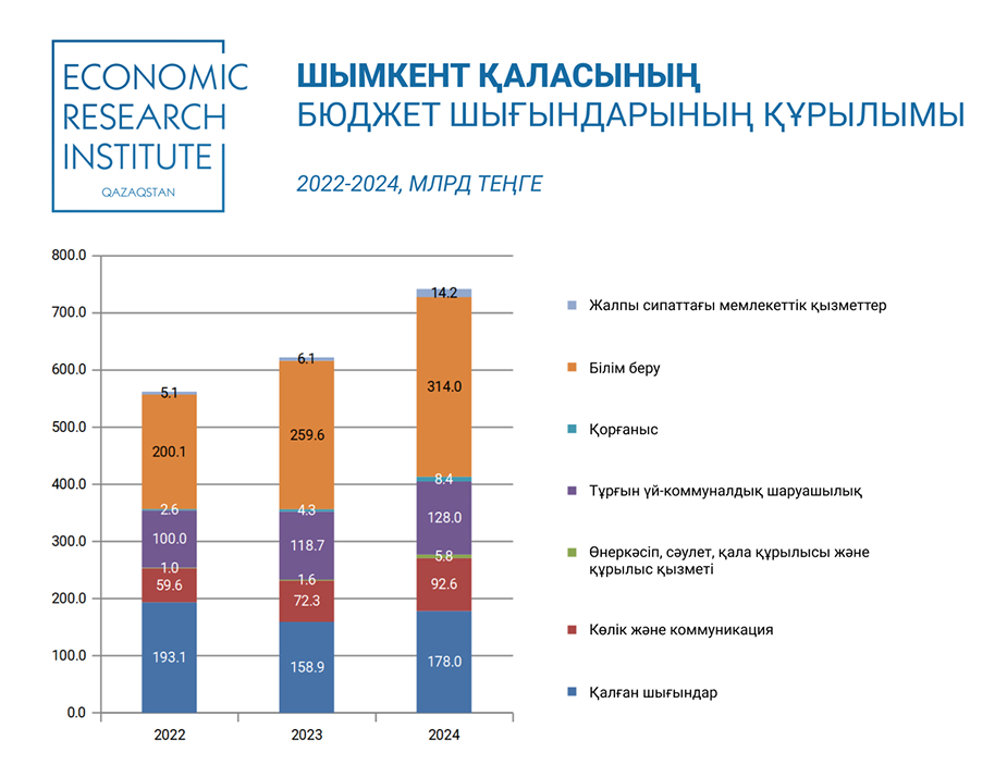 Шымкент қаласы бюджетінің шығындары (бағыттар бойынша шығыстар) 2022-2024 жылдары 561,6 млрд теңгеден 741,0 млрд теңгеге дейін 32,0%-ке ұлғайды.