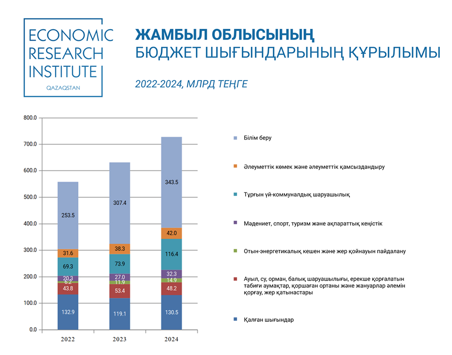 Жамбыл облысы бюджетінің шығындары (бағыттар бойынша шығыстар) 2022-2024 жылдары 557,5 млрд теңгеден 727,9 млрд теңгеге дейін 30,6%-ке өсті.