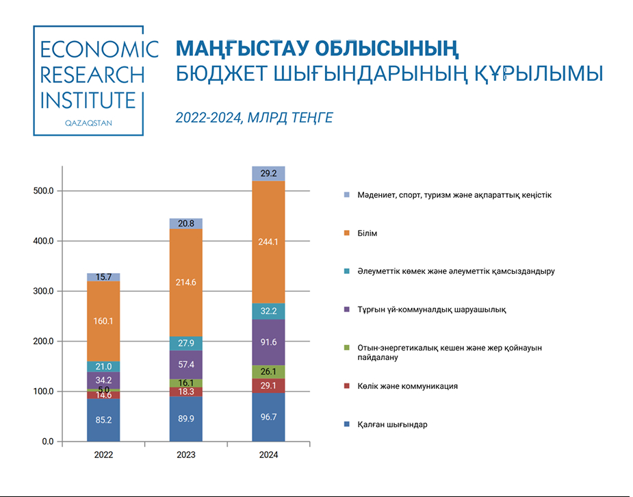 Маңғыстау облысы бюджетінің шығындары (бағыттар бойынша шығыстар) 2022-2024 жылдары 335,7 млрд теңгеден 549,0 млрд теңгеге дейін 63,5%-ке өсті.