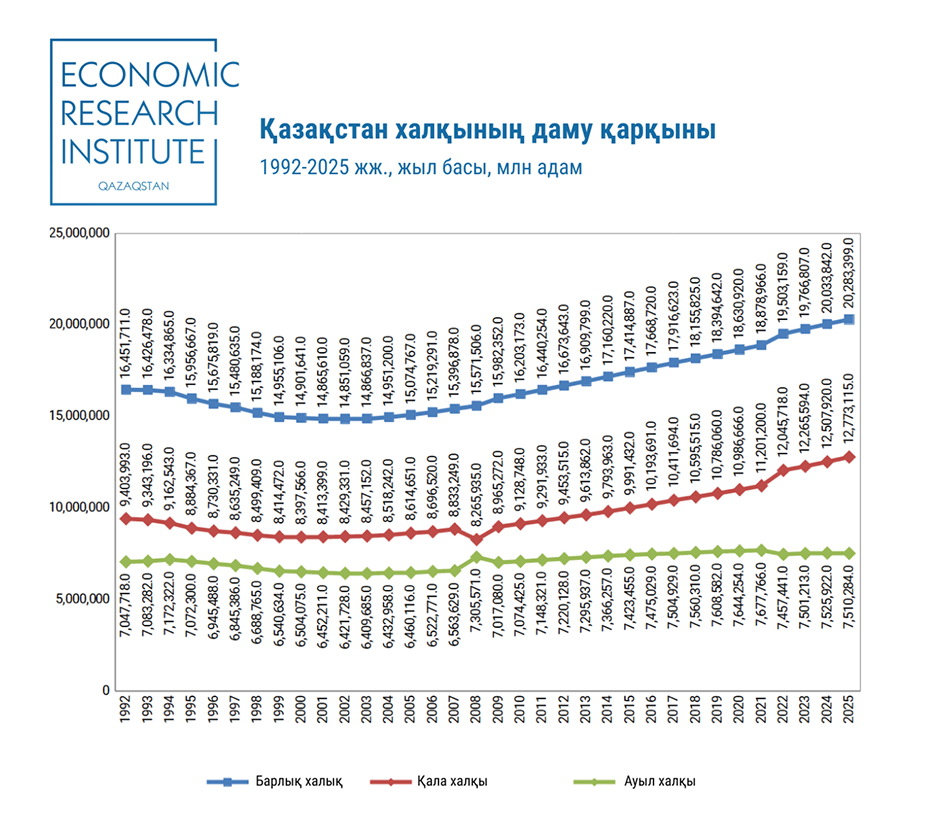 Қазақстанның тәуелсіздік жылдарындағы демографиялық дамуы 1990 жылдардың терең құлдырауынан қазіргі тұрақты өсуге дейінгі күрделі жолдан өтті. Бүгін елімізде айтарлықтай демографиялық әлеует бар, алайда халықтың жас құрылымындағы өзгерістер, бірқатар өңірлердегі депопуляция, халықтың ауылдардан қалаларға, облыстардан мегаполистерге көші-қоны сияқты бірқатар сын-қатерлер орын алады. Отбасыларды қолдауды, өңірлерді дамытуды және ішкі көші-қонды реттеуді қамтитын тиімді демографиялық саясат халықтың теңгерімді дамуын қамтамасыз етуге және ұзақ мерзімді перспективада елдің адами капиталын нығайтуға қабілетті.