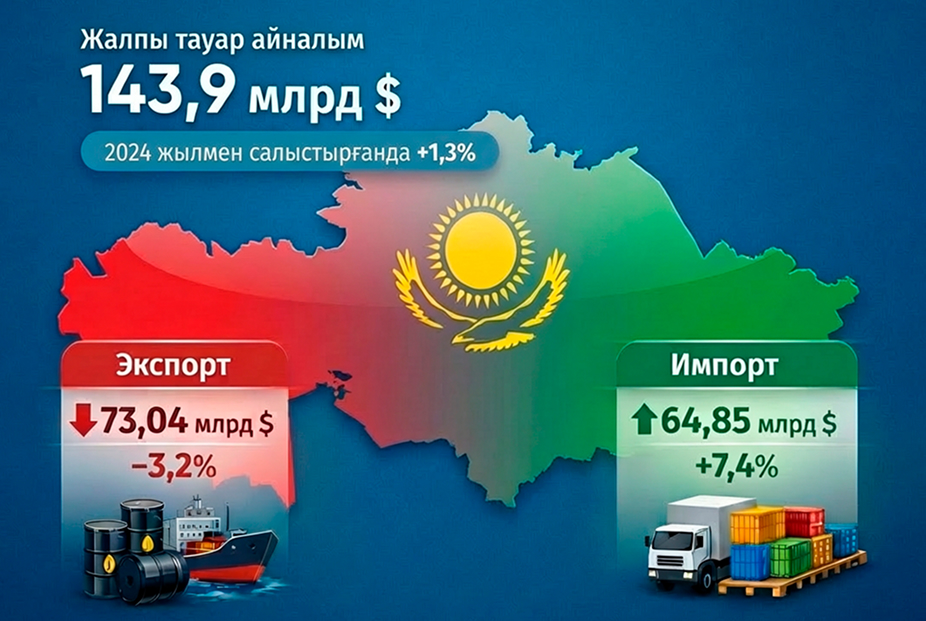 2025 жылдың қорытындысы бойынша Қазақстандағы тауарайналым 143,9 млрд АҚШ долларына жетіп, былтырмен салыстырғанда 1,3% артты. Жалпы сыртқы сауда көлемі ұлғайғанымен, экспорт 3,2%-ға төмендеп, 73,04 млрд АҚШ долларын құрады. Ал импорт қарқыны, керісінше, жоғарылап 7,4%-ға өсіп, 64,85 млрд АҚШ долларына жетті. Соған қарамастан, сауда балансының оң сальдосы 14,2 млрд АҚШ доллары деңгейінде қалды.