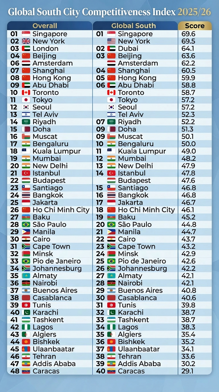 2026 жылдың қаңтарында SuperSymmetry институты Жаһандық Оңтүстік қалаларының бәсекеге қабілеттілік рейтингі (Global South City Competitiveness Index, GS-CCI 2025/2026) ұсынылған Driving Urban Advantage in the Next Economy баяндамасын жариялады.