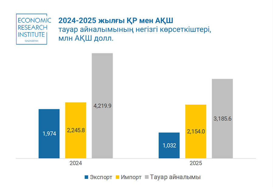 2025 жылдың қорытындысы бойынша Қазақстан мен АҚШ арасындағы тауар айналымы өткен жылмен салыстырғанда 24,5%-ке төмендеп, 3,2 млрд АҚШ долларына жетті. Экспорт көлемі 47,7%-ке төмендеп, 1,03 млрд АҚШ долларына жетті, бұл ретте импорт көлемі 2,2 млрд АҚШ долларына дейін 4,1%-ке төмендеді.