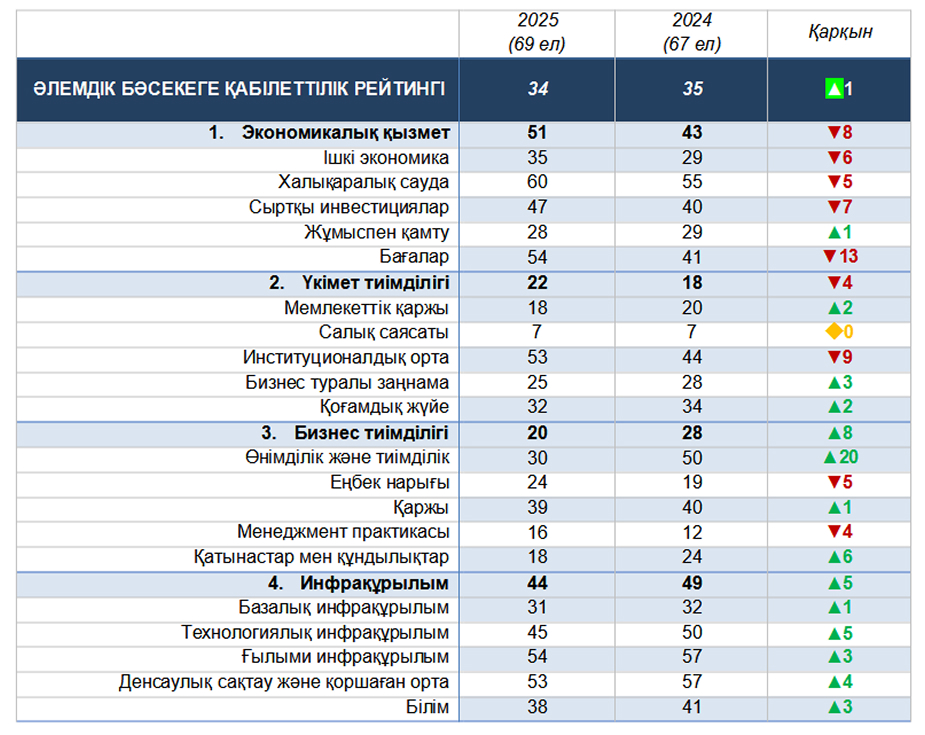 IMD 2025 әлемдік бәсекеге қабілеттілік рейтингіндегі елдердің позициялары мен мәндері
