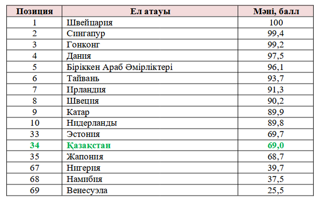 Қазақстан 2024 жылмен салыстырғанда өз позициясын бір тармаққа жақсартып, 34-ші орынға ие болды.