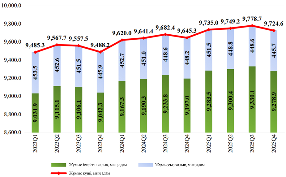 Елдегі жұмыссыздық деңгейі тұрақты және 2025 жылдың IV тоқсанында 4,6%-ке жетті. Бұл ретте жұмыссыздардың жалпы саны 445,7 мың адам, бұл өткен жылдың сәйкес кезеңімен салыстырғанда 2,5 мың адамға аз. 15 пен 34 жас аралығындағы жастар арасындағы жұмыссыздық деңгейі – 3,1%. 2025 жылғы 3-тоқсандағы бір қызметкердің орташа айлық атаулы жалақысы 10%-ке өсті (өткен жылдың тиісті тоқсанымен салыстырғанда) және 429 368 теңгеге жетті, нақты жалақы индексі өткен жылдың тиісті тоқсанына қатысты 98%.