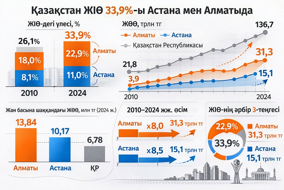 2024 жылы жан басына шаққандағы ЖӨӨ-нің орташа республикалық көрсеткіші 6,78 млн теңгені құрағанда Алматыда бұл көрсеткіш 13,84 млн теңгеге, ал Астанада 10,17 млн теңгеге жетіп, бұл қалалар мұнай-газ өңірлерінен кейін екінші орында тұрған ел көшбасшыларының қатарына кіреді.