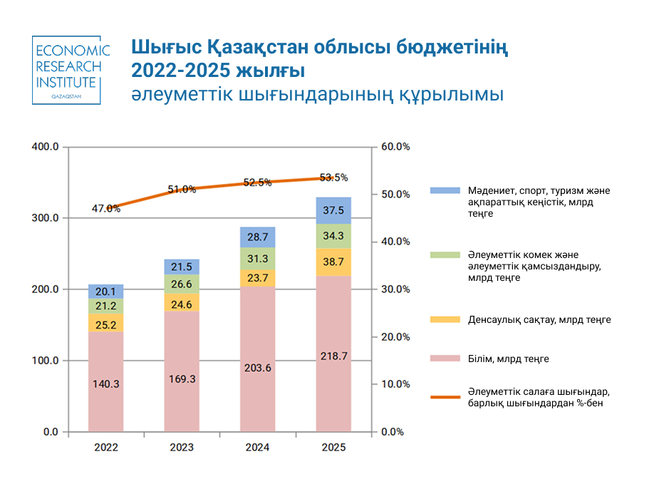 Шығыс Қазақстан облысының әлеуметтік салаға шығындары 2022-2025 жылдары облыс бюджетінің барлық шығындарының орта есеппен 51,0%-не тең. Олар 2022 жылғы 206,8 млрд теңгеден 2025 жылы 329,2 млрд теңгеге дейін 59,2%-ке ұлғайды.