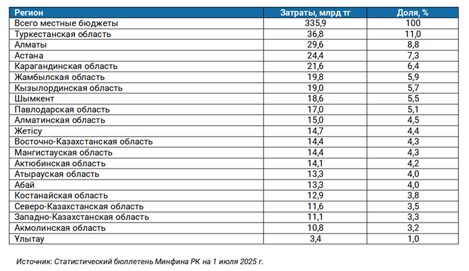 Районы и села обеспечивают точечные меры, максимально приближенные к населению: помощь на дому, сопровождение детей с инвалидностью, услуги индивидуальных помощников и специалистов жестового языка, а также экстренную социальную поддержку. Такой подход закрепляет за каждым уровнем власти конкретные зоны ответственности и усиливает управляемость в социальной сфере. Расходы регионов: цифры и контрасты По итогам первого полугодия 2025 года расходы местных бюджетов на социальную помощь и обеспечение составили 335,9 млрд тенге, что на 5,2% больше, чем годом ранее. Однако масштабы нагрузки заметно различаются по регионам.