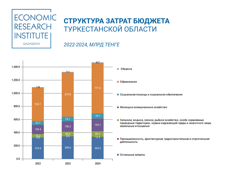 Затраты (расходы по направлениям) бюджета Туркестанской области за 2022-2024 годы выросли на 34,6% – с 1,1 трлн тенге до 1,5 трлн тенге.