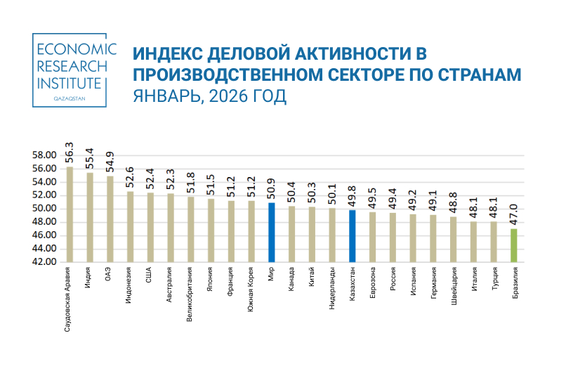 По итогам января отмечается небольшое ослабление динамики обрабатывающей промышленности Казахстана: индекс деловой активности Freedom Holding Corp. опустился до 49,8 и оказался чуть ниже пороговой отметки 50,0 (в декабре – 51,0), что стало очередным ухудшением ситуации за последние месяцы. Ключевым фактором выступило усиление инфляционного давления на фоне повышения ставки НДС: около 44% участников опроса отметили рост цен на ресурсы, а темпы подорожания стали самыми высокими с ноября 2022 года, затронув сырье и услуги. Рост НДС также чаще всего назывался причиной ускорения цен на готовую продукцию – инфляция здесь обновила рекорд исследования, превысив уровень февраля 2021 года. На этом фоне сохраняется неопределенность относительно влияния НДС на дальнейшую работу компаний, поэтому деловая уверенность остается сравнительно низкой, хотя оптимизм немного укрепился из-за ожиданий притока заказов. При этом новые заказы в январе умеренно сократились после декабрьского роста (на фоне задержек в заключении контрактов), что привело к незначительному снижению выпуска.