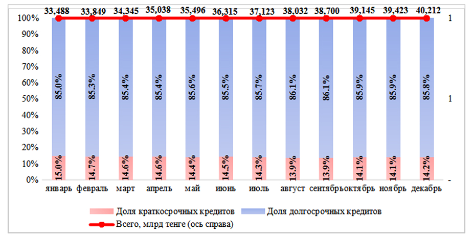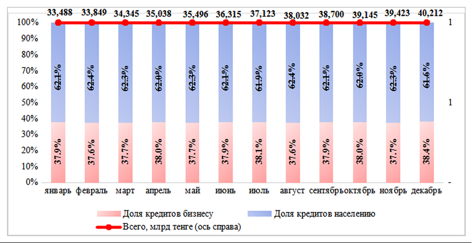 По результатам декабря 2025 года кредиты экономике от банков второго уровня составили 40,2 трлн тенге. С начала года рост объема кредитования составил 20,1%.