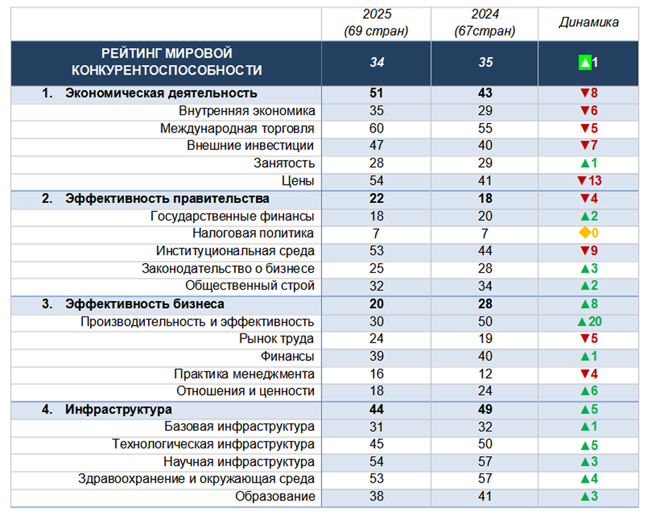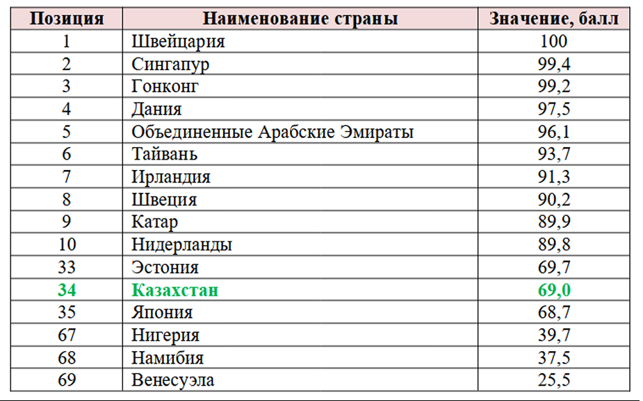 Таким образом, рейтинг IMD дает целостное представление о сильных и уязвимых сторонах стран – от качества государственного управления до условий ведения бизнеса и уровня развития инфраструктуры. Он служит важным ориентиром, прежде всего для инвесторов, а также для государственных органов при анализе конкурентных преимуществ и определении приоритетов развития. По итогам рейтинга 2025 года лидирующие позиции заняли Швейцария, Сингапур и Гонконг, продемонстрировав наиболее благоприятные условия для экономического развития. Казахстан занял 34-е место, улучшив свою позицию на один пункт по сравнению с 2024 годом.