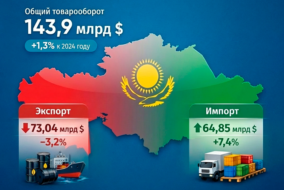 По итогам 2025 года товарооборот Казахстана составил 143,9 млрд долл. США, увеличившись на 1,3% по сравнению с предыдущим годом. Несмотря на общий рост внешнеторгового оборота, экспорт снизился на 3,2% и составил 73,04 млрд долл. США, тогда как импорт продемонстрировал более высокую динамику, увеличившись на 7,4% до 64,85 млрд долл. США. При этом сохраняется положительное сальдо торгового баланса на уровне 14,2 млрд долл. США.