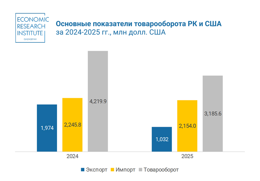 По итогам 2025 года товарооборот между Казахстаном и США составил 3,2 млрд долл. США, снизившись на 24,5% по сравнению с предыдущим годом. Объем экспорта снизился на 47,7% и составил 1,03 млрд долл. США, объем импорта при этом снизился на 4,1% до 2,2 млрд долл. США.