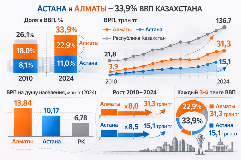 Пространственная структура экономики Казахстана приобретает всё более выраженный агломерационный характер. Крупнейшие города – Алматы и Астана, закрепляются в роли ключевых центров формирования добавленной стоимости, инвестиций и занятости, постепенно концентрируя в себе высокопроизводительные виды экономической деятельности.По итогам 2024 года на долю Алматы приходится 22,9% ВВП страны, а долю Астаны - 11,0%. Таким образом, два города формируют 33,9% национальной экономики, тогда как в 2010 году их совокупный вклад составлял 26,1%. Иными словами, почти каждый третий тенге, создаваемый в Казахстане, производится в двух центрах агломераций.
