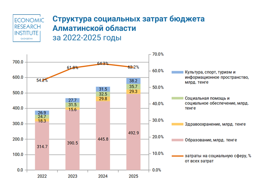 За 2022-2025 годы затраты на социальную сферу Алматинской области заняли в среднем 60,6% от всех затрат бюджета области. Они показали рост на 55,0% – с 384,6 млрд тенге в 2022 году до 596,1 млрд тенге в 2025 году.