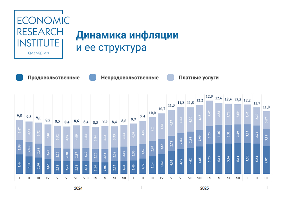 Основной вклад в динамику инфляции вносят продовольственные товары в размере 44,3% (то есть из 11,0% общей инфляции 4,87 п.п. приходится на продовольственные товары). По сравнению с мартом 2025 года доля продовольственных товаров увеличилась на 12,9 п.п. (с 31,4% до 44,3%). При этом по сравнению с прошлым месяцем она уменьшилась на 1,4 п.п, с 45,6% до 44,3%.