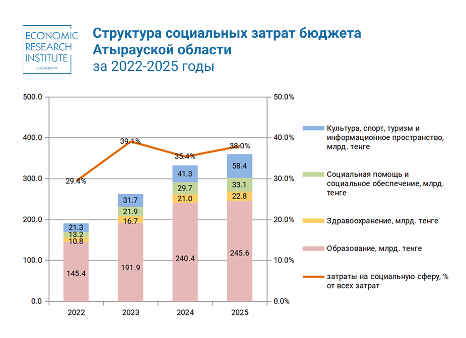 В 2022-2025 годах затраты на социальную сферу бюджета Атырауской области в среднем формировали 35,5% совокупных бюджетных затрат. За рассматриваемый период их объем увеличился в 1,9 раза – с 190,7 млрд тенге (29,4% от всех затрат) в 2022 году до 360,0 млрд тенге (38,0% от всех затрат) в 2025 году.